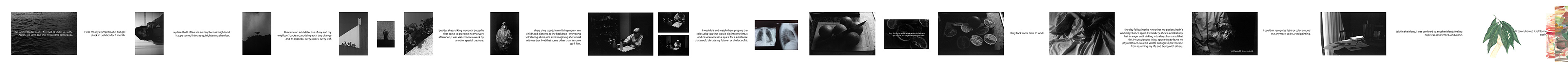 During the summer of 2020 I tested positive for Covid-19 while I was in the Azores. What would be a short sojourn, turned into a two-month stay in the island, spending one of the months in isolation. At each new positive test - and, consequently, each extra week of isolation - I seemed to plunge into a deeper hole from which I could no longer see the light. I was unable to conceive an ending - or new beginning - I lost the ability to plan, imagine or yearn for anything. Mostly asymptomatic, the frustration of isolating from everything and everyone when, physically, I felt essentially fine became my biggest prison. To have become as though radioactive, when I felt the same as always. This series narrates my journey and attempt to accept The Absurd and equally serves (and served) as a means to better comprehend who I am in and out of isolation, in and out of the island.